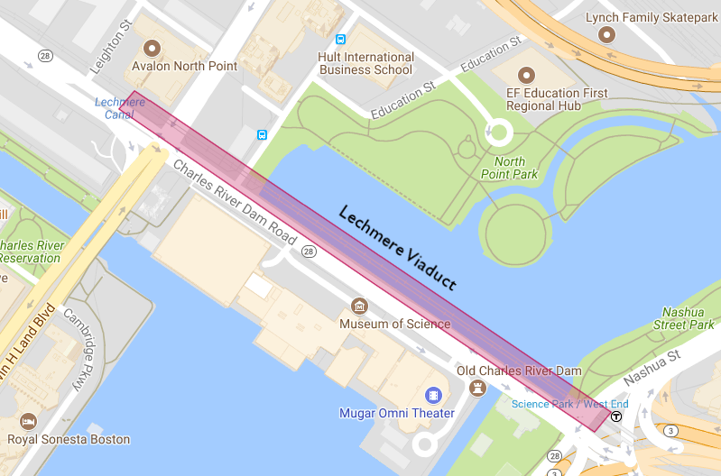 The historic lock and Boston’s Museum of Science, built in 1949 on top of the first Charles River dam, are immediately to the south of the Viaduct. A dam farther downstream, built and operational in 1978, stabilized the water level of the Charles River on both sides of the Lechmere Viaduct. To the west, the Cambridge side, dubbed the “Lost Half Mile” by the Massachusetts Department of Conservation and Recreation (DCR) benefited from the 2003 construction of the Central Artery’s Leonard P. Zakim Bridge. With its ramps high above the river, the Zakim Bridge brought an opportunity on the Cambridge side for a lagoon and new riverfront, with 40 acres of new landscaped parkland — North Point Park, a skate park, two residential towers, dramatic headquarters buildings, and major new additional high-rise development surrounding Lechmere station and into the area bordering on MIT. Similar public realm improvements are planned for the Boston side of the river.