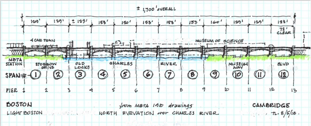 This sketch of the North Side elevation of the Lechmere Viaduct furnishes the key to designations of Spans (arches and bridge) and Piers (abutments) cited in the working drawings from 1910.