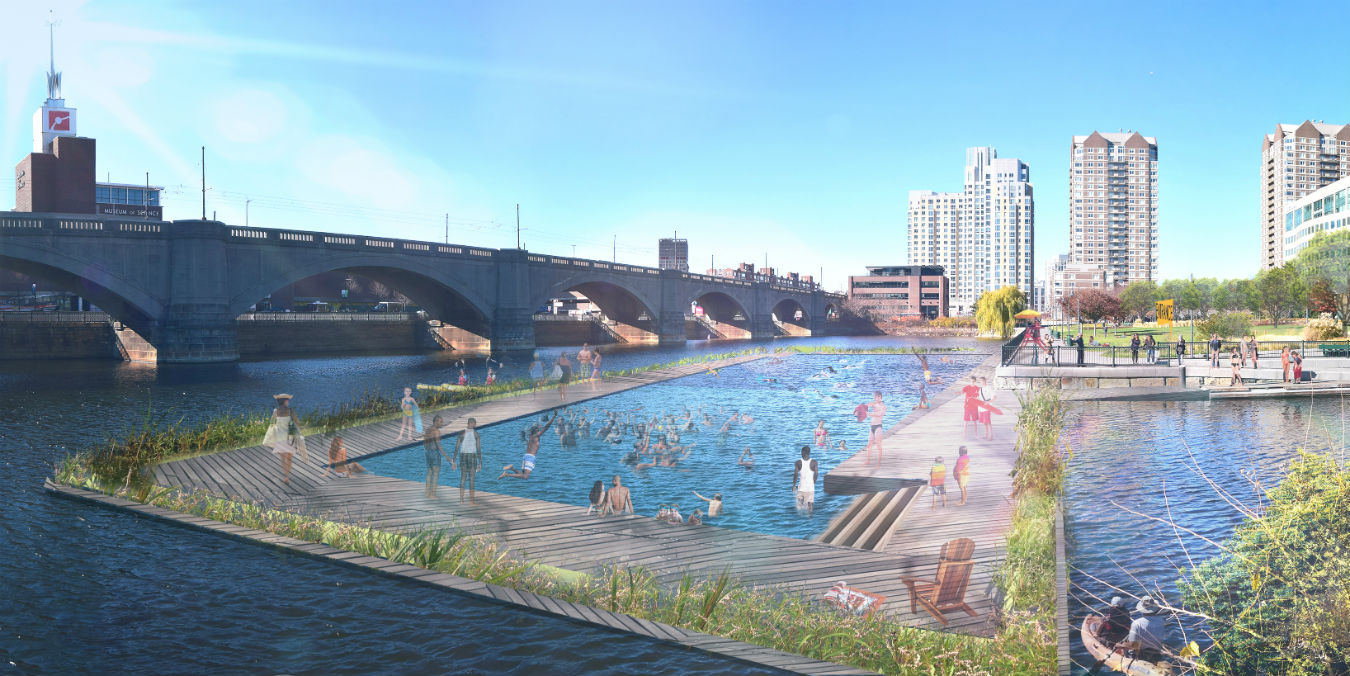 The Charles River Conservancy is working “to build a safe, fun, and accessible seasonal swimming facility in the Charles River to be enjoyed by everyone,” next to the Lechmere Viaduct. Feasibility studies and concept design has been completed. See images and read more here: http://www.thecharles.org/swim-park-project/