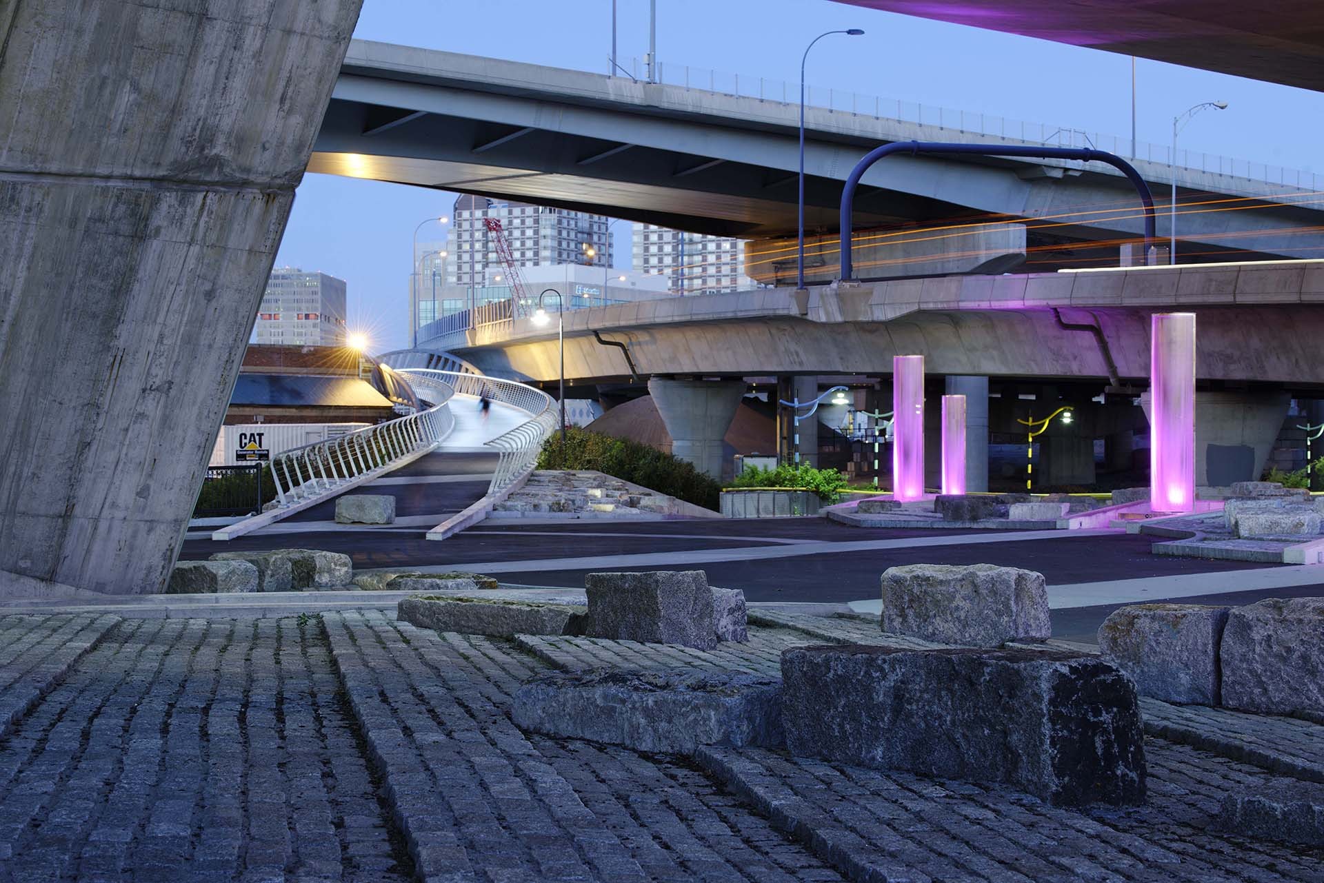 Many recent initiatives are working to improve the public realm of this area. Providing beautiful, safe, and continuous pedestrian access along the Charles River throughout the day and seasons is a priority of the new park system. An artfully illuminated Lechmere Viaduct is a critical missing link in this new system.